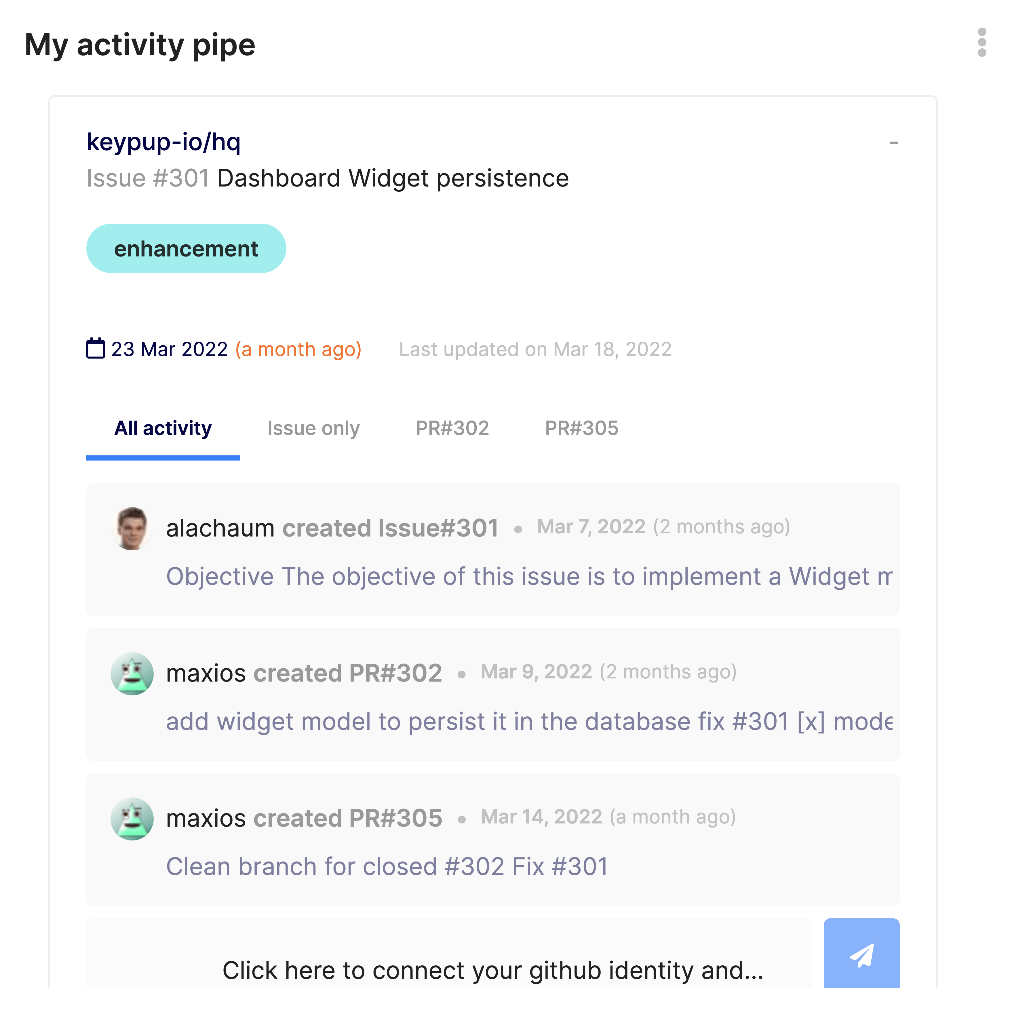 - My Activity Pipe This insight complements project management boards (e.g., Jira) by showing you detailed information about issues and pull requests, correlated together, from data gathered from apps (e.g., Jira + GitHub). Your tasks are sorted by due dates and automatically refreshed as issues and pull requests get updated by your team, so you can follow updates across your assignments.